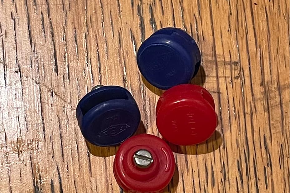 Hvis noen skulle ha bruk for «endestoppere» (?) for tåremmene sine, så finnes det noen NOS røde og blå til overs her.